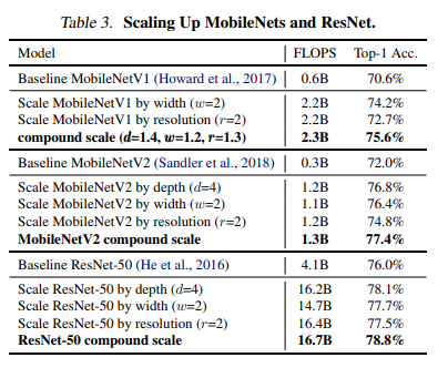 Để kiểm chứng tính hiệu quả của mô hình, trước tiên nhóm tác giả áp dụng phương pháp thu phóng quy mô của mình cho MobileNets và ResNet được sử dụng rộng rãi. Bảng sau đây hiển thị kết quả ImageNet của việc thu phóng chúng theo các cách khác nhau. So với các phương pháp chia tỷ lệ đơn chiều khác, phương pháp thu phóng phức hợp của nhóm tác giả cải thiện độ chính xác trên tất cả các mô hình này.