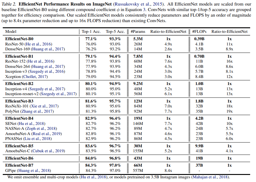 Bảng sau cho thấy hiệu suất của tất cả các mô hình EfficientNet được thu phóng từ cùng một mô hình EfficientNet-B0 khi huấn luyện trên ImageNet. Các mô hình EfficientNet của nhóm tác giả thường sử dụng thứ tự các tham số và FLOPS ít hơn so với các ConvNets khác với độ chính xác tương tự. Đặc biệt, EfficientNet-B7 của chúng tôi đạt độ chính xác top1 84,3% với thông số 66M và 37B FLOPS, chính xác hơn nhưng nhỏ hơn 8,4 lần so với GPipe tốt nhất trước đây. Những lợi ích này đến từ cả kiến trúc tốt hơn, thu phóng quy mô tốt hơn và cài đặt đào tạo tốt hơn được tùy chỉnh cho EfficientNet.