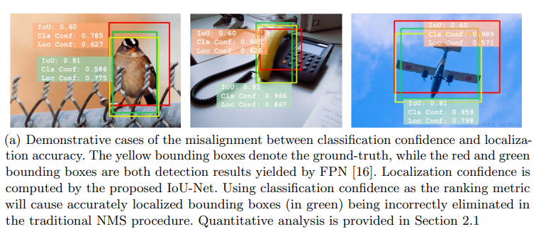 Như được thể hiện trong hình trên, các bounding box được phát hiện có mức độ phân loại cao hơn trái ngược lại có phần trùng lặp nhỏ hơn với ground-truth tương ứng. Khi đó sự sai lệch giữa độ tin cậy của phân loại và độ chính xác của bản địa hóa có thể dẫn đến các bounding box được bản địa hóa chính xác bị loại bỏ khi so sánh với các hộp kém chính xác hơn trong NMS. Vấn đề này được nói khá kĩ ở trong paper nên mình cũng không trình bày lại nữa.